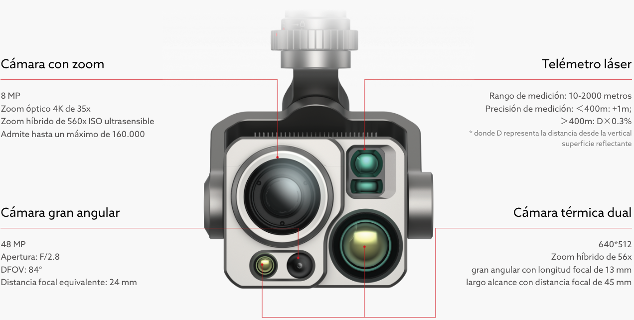 La cámara térmica admite zoom híbrido de 56x, lentes de imagen térmica duales, con una resolución de 640*512. Cuenta con un objetivo gran angular de 13 mm y un teleobjetivo de 45 mm, que permiten obtener una visión general con distancias focales cortas y una visualización orientada al detalle con distancias focales largas.