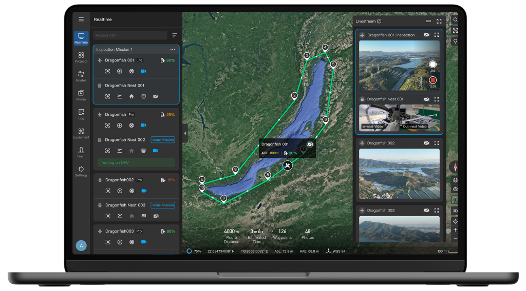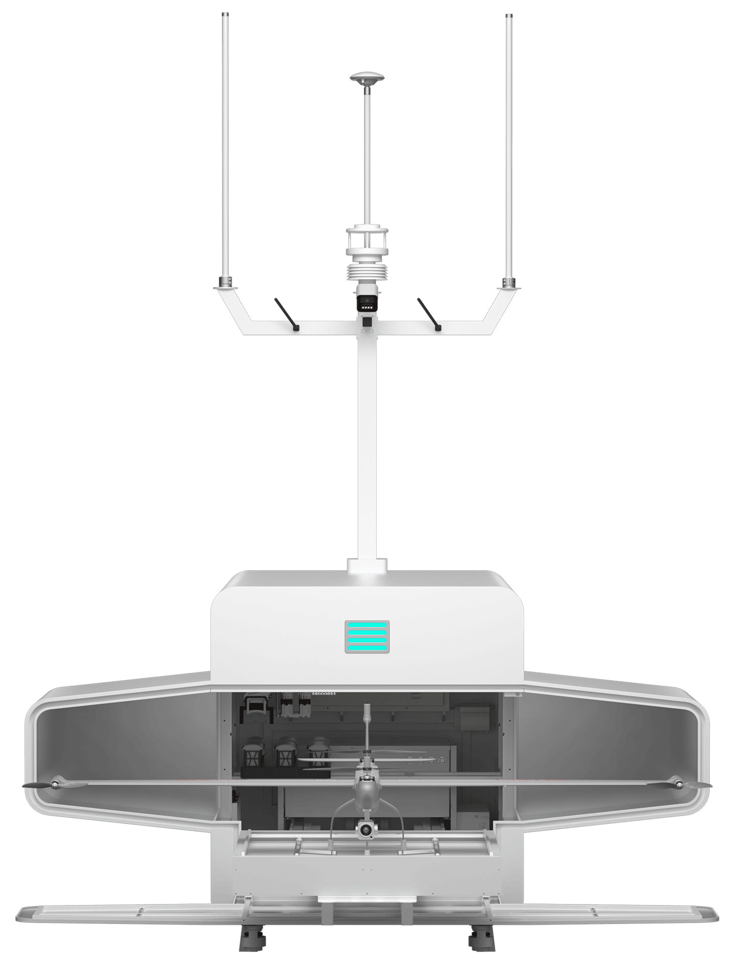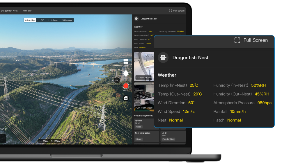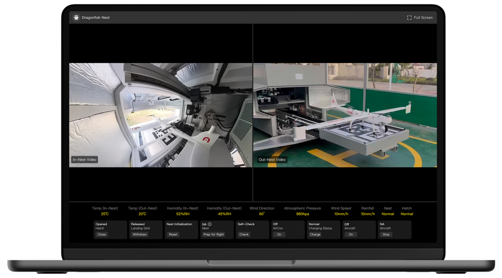 El modo de operación totalmente automático utiliza múltiples sensores y algoritmos inteligentes para monitorizar el Dragonfish, el Nest y otros equipos. El Nest colabora con el módulo de monitorización meteorológica y la cámara de vigilancia externa para recopilar datos en tiempo real sobre el entorno, incluyendo temperatura, humedad, dirección y velocidad del viento, y precipitaciones, para garantizar vuelos seguros y fiables.